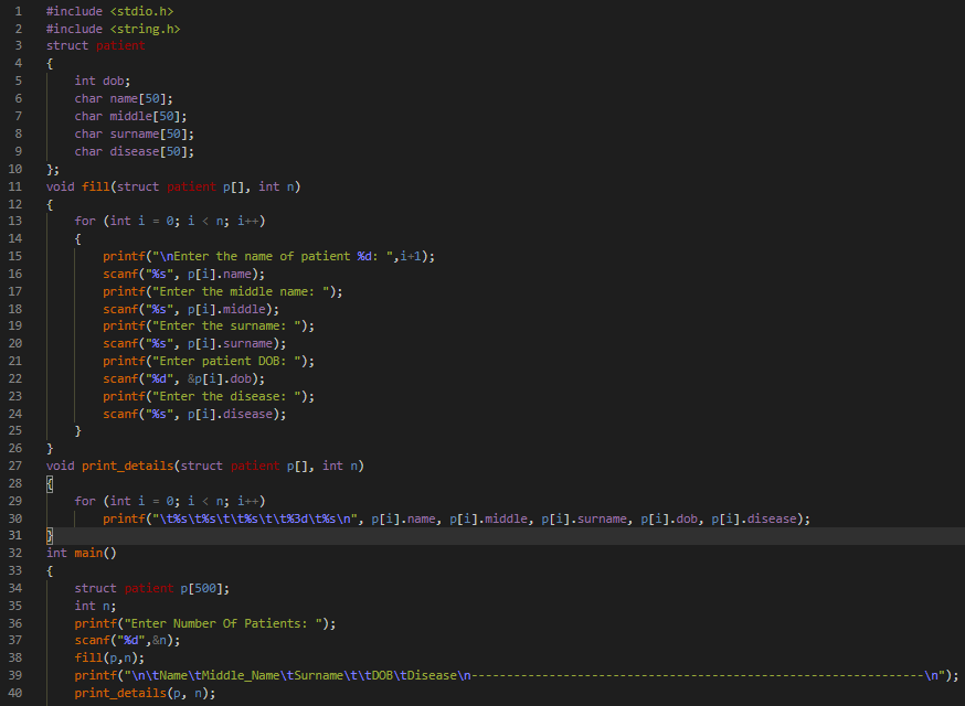 Create a structure Patient having patient's first name, middle name, surname, date of birth and disease and print it.