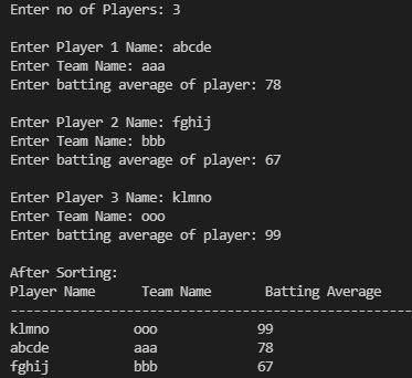 Create a structure Player having player's name, team name and batting average as data members. Write a program to print details of those players in descending order of their batting average.