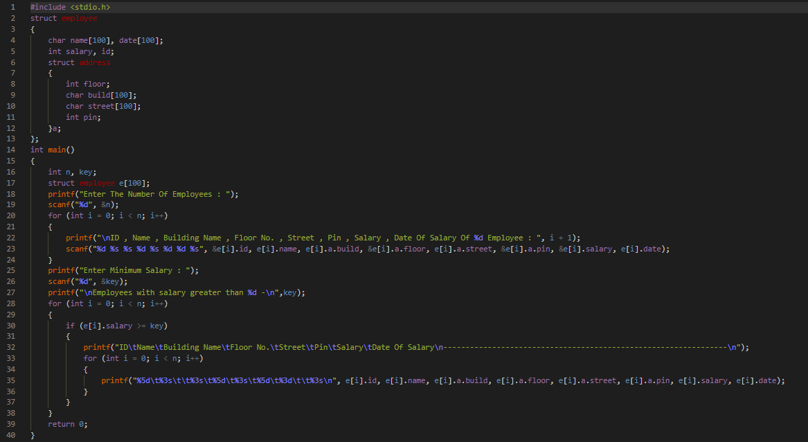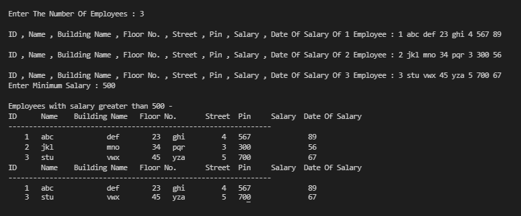 Create a structure Employee having employee's name, id, Building Name , Floor No. , Street , Pin , Salary , Date Of Salary as data members. Write a program to print details of the employees whose salary is greater than a certain value.