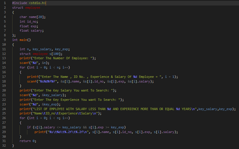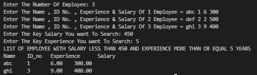 Create a structure Employee having employee's name, id, experience and salary as data members. Write a program to print details of the employees whose salary is less than a certain value AND whose experience is more than a certain value.