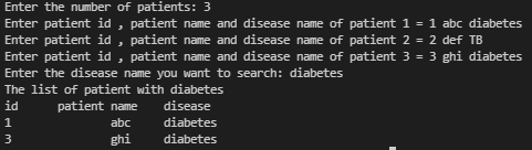 Create a structure Patient having ID, patient_name and disease_name as data members. Write a program to read details of patients and print details of those patients having ‘diabetes’ (using function).